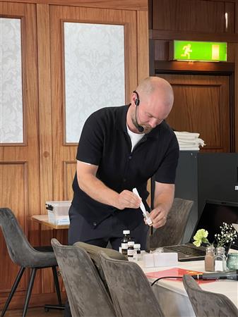 Fredrik Dahlman, firma TuffTuff... ... berättade hur det kom sig, hur man blir det och vad han gör idag. På bilden preparerar han dofter för att illustrera sin berättelse.Jättetrevlig kväll!